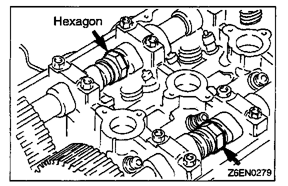 1. Using a wrench, hold the camshaft at its hexagon (between the No. 2 and No.3 journals) and tighten the bolt to the specification.