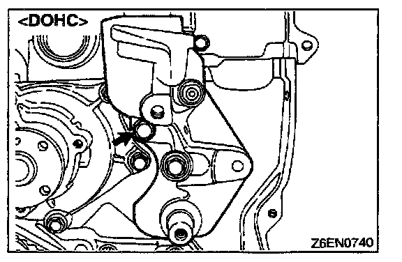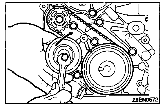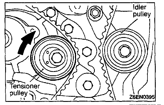 4. Move the tensioner "B" in the direction of arrow while lifting with a finger to give a sufficient tension to the tension side of timing belt. In this condition, tighten bolt to secure tensioner "B". When the bolt is tightened, use care to prevent shaft from turning together. If shaft is turned together, belt will be overtensioned.