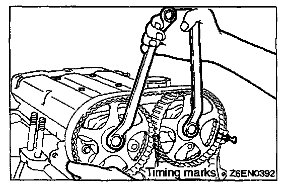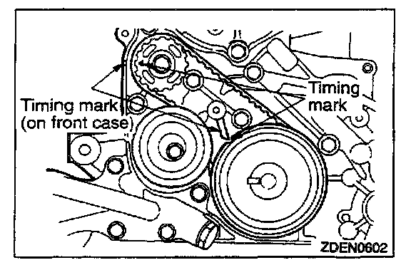 5. Check to ensure that timing marks on sprockets and front case are in alignment.