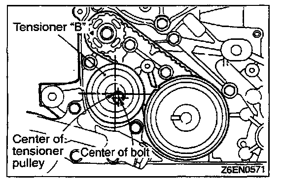 3. Make sure that the relationship between the tensioner pulley center and the bolt center is as shown in the illustration.