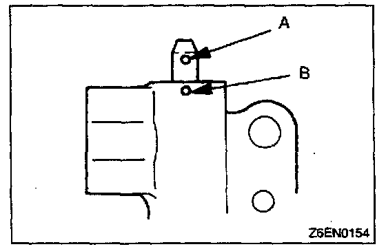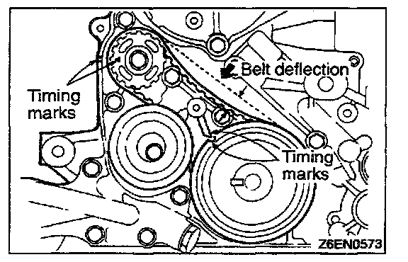 6. Press with index finger the center of span on tension side of timing belt "B". The belt must deflect 5-7 mm (0.20-0.28 in.).