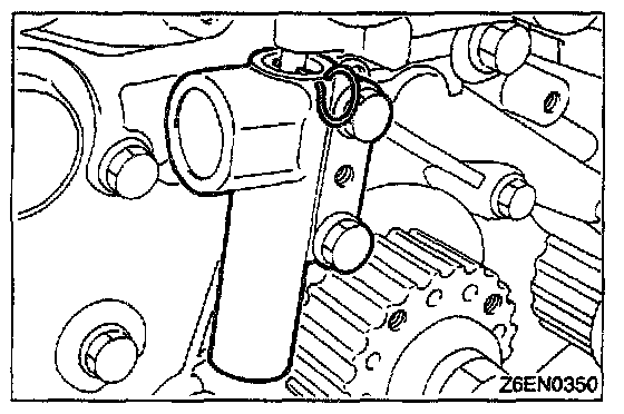 4. Insert a Phillips screwdriver [shank diameter 8 mm (.31 in.)] through the hole. If it can be inserted as deep as 60 mm (2.4 in.) or more, the timing marks are correctly aligned. If the inserted depth is only 20-25 mm (0.8-1.0 in.), turn the oil pump sprocket one turn and realign the timing marks. Then check to ensure that the screwdriver can be inserted 60 mm (2.4 in.) or more. Keep the screwdriver inserted until the installation of the timing belt is finished.
