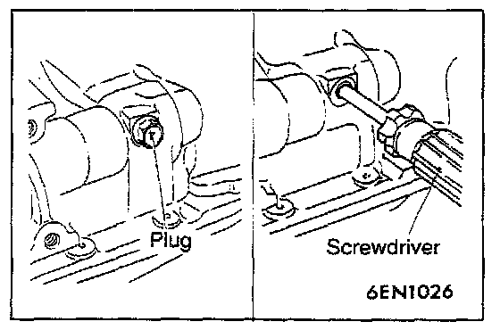 1. Insert a Phillips screwdriver [shank diameter 8 mm (.31 in.)] through the plug hole on the left side of the cylinder block to block the left counterbalance shaft.