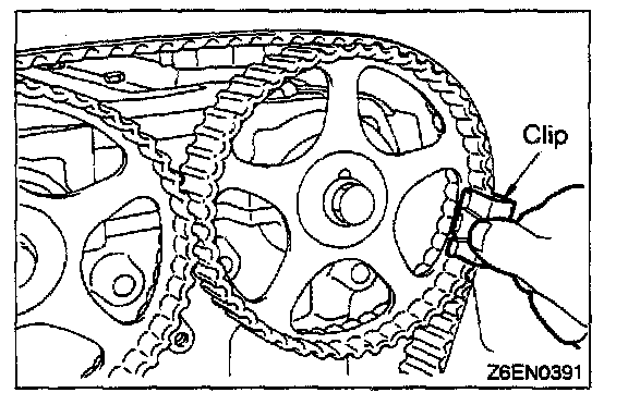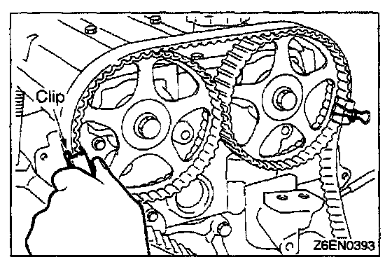 5. Thread the timing belt over the intake side camshaft sprocket and fix it at indicated position by a clip.