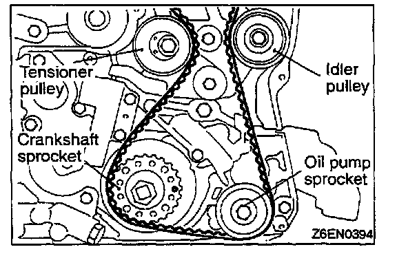 8. Thread the timing belt over the idler pulley, the oil pump sprocket, the crankshaft sprocket and the tensioner pulley in that order.