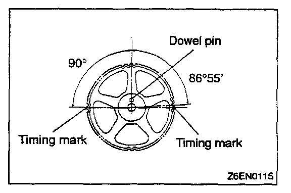 NOTE: The same camshaft sprocket is used for the intake and exhaust camshafts. This is provided with two timing marks. When the sprocket is mounted on the exhaust camshaft, use the timing mark on the right with the dowel pin hole on top. For the intake camshaft sprocket, use the one on the left with the dowel pin hole on top.