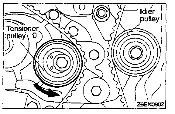 10. Lift up the tensioner pulley in the direction of arrow and tighten the center bolt.