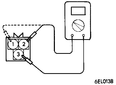 2. Measure the resistance between connector terminals 3 and 2 (the coils at the No.1 and No.4 cylinder sides) of the ignition coil, and between terminals 3 and 1 (the coils at the No. 2 and No. 3 cylinder sides).