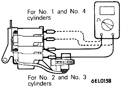 4. Measure the resistance between the high-Voltage terminals for the No. 1 and No. 4 cylinders, and between the high-Voltage terminals for the No. 2 and No. 3 cylinders.