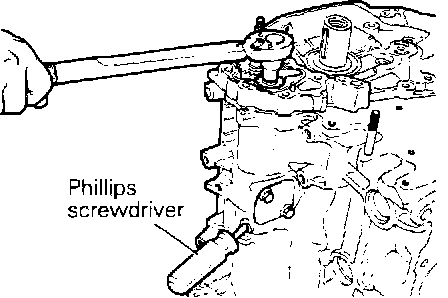 5. Insert a screwdriver through plug hole in left side of cylinder block to keep shaft in position, Fig. 22, then tighten bolt to specification.