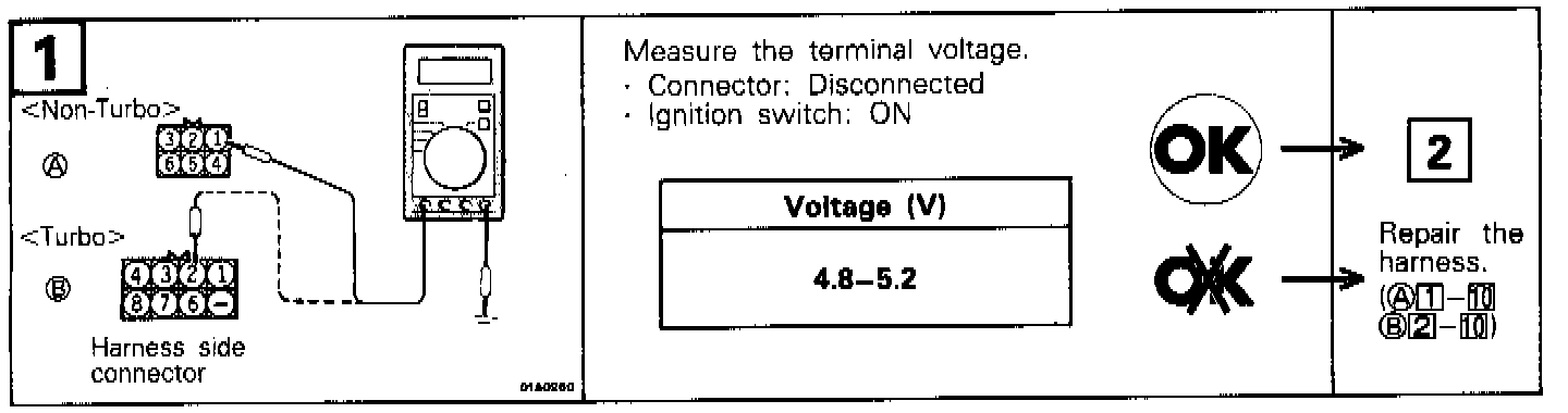 2. If the MAF sensor output Voltage is other than 0 when the ignition switch is turned on engine off), check for a faulty MAF sensor or Engine Control Module (ECM).
