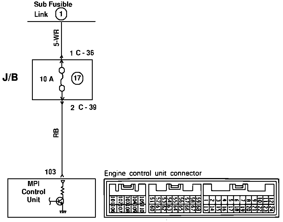 4. Using an Ohm meter, check for continuity between chassis ground (not the negative battery terminal) and ECU harness terminal 103.