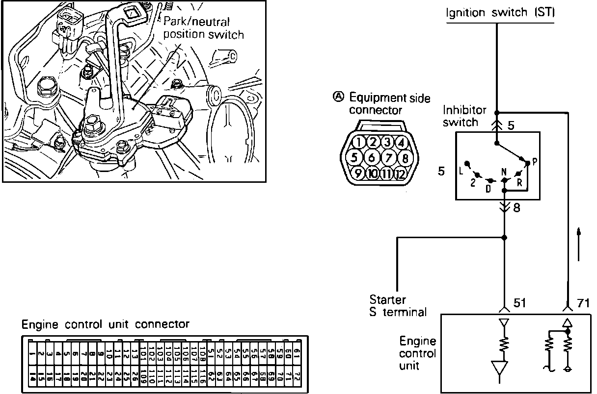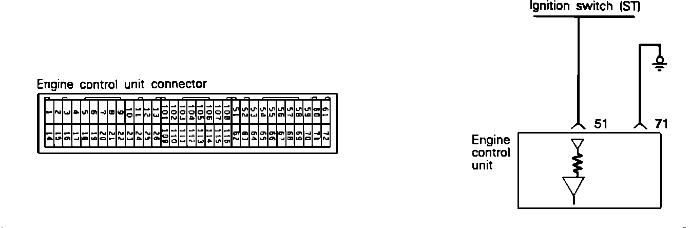 The ignition switch "ON" signal is provided to the ECU through the control relay. Refer to the images for the "START" signal.
