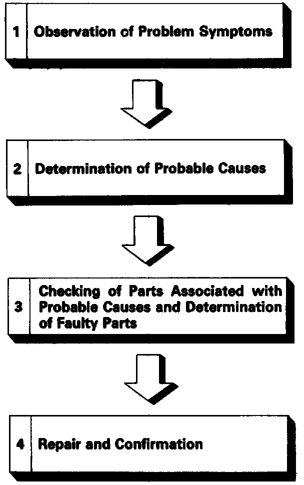If an attempt is made to solve a problem without going through correct steps for troubleshooting, the problem symptoms could become more complicated, resulting in failure to determine the causes correctly and making incorrect repairs. The four steps below should be followed in troubleshooting.