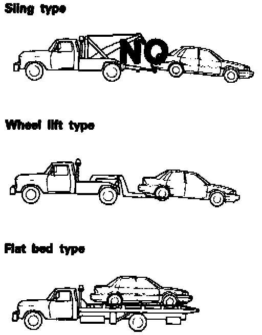 CAUTION: This vehicle cannot be towed by a wrecker using sling-type equipment to prevent the axle beam from deformation. If this vehicle is towed, use wheel lift or flat bed equipment.