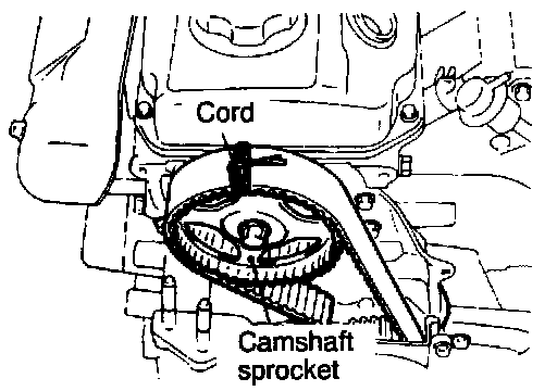 2. Tie the camshaft sprocket and timing belt with a cord. Otherwise, ignition timing will be maladjusted.