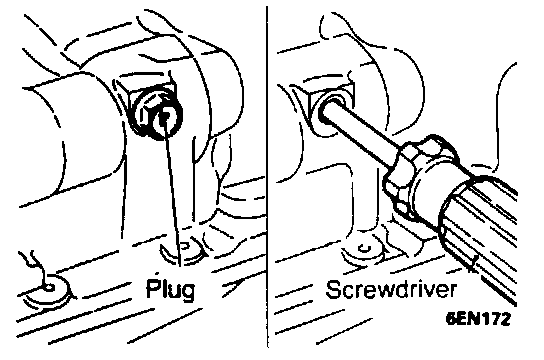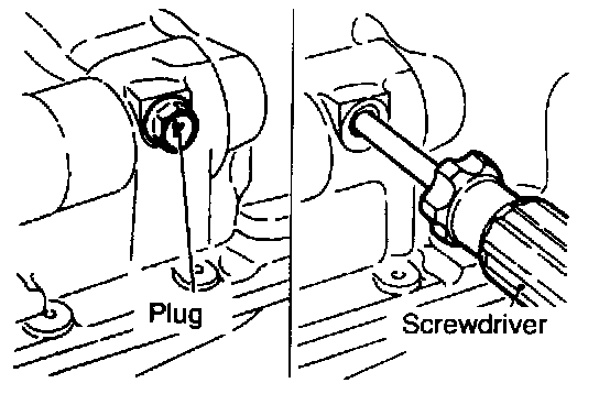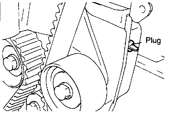 2. Remove the plug on the cylinder block and insert a Phillips screwdriver [shank diameter 8 mm (0.31 in.)] through the hole. If it can be inserted as deep as 60 mm (2.4 in.) or more, the timing marks are correctly aligned. If the inserted depth is only 20-25 mm (0.8 - 1.0 in.), turn the oil pump sprocket one turn and realign timing marks. Then check that the screwdriver can be inserted 60 mm (2.4 in) or more. Keep the screwdriver inserted until the installation of the timing belt is finished.