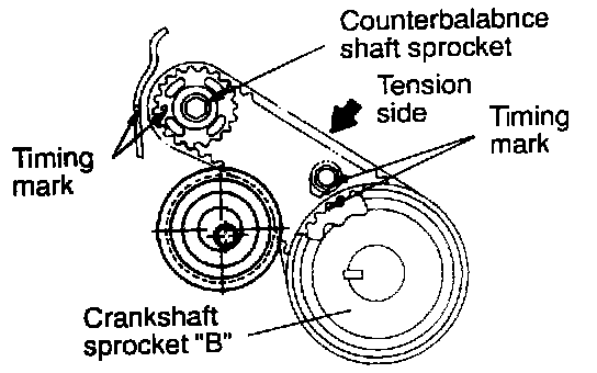 1. Align the crankshaft sprocket "B" timing mark the counterbalance shaft sprocket timing mark.