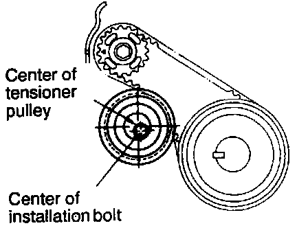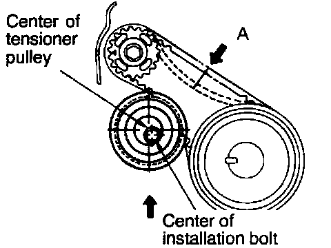 1. Temporarily fix the timing belt "B" tensioner so that the center of the tensioner pulley is to the left and above the center of the installation bolt, and temporarily attach the tensioner pulley so that the flange is toward the front of the engine.