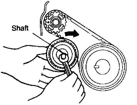 (1) Install the timing belt around the tensioner pulley and crankshaft sprocket and secure the timing belt onto the tensioner pulley with your left hand.