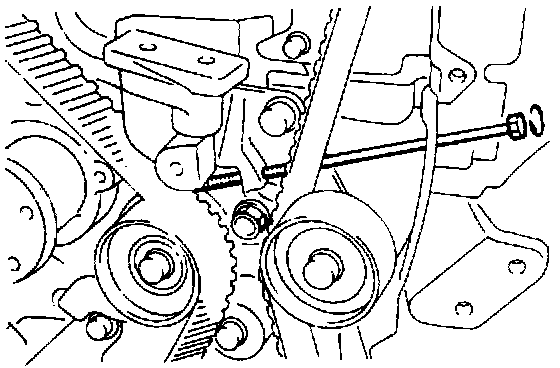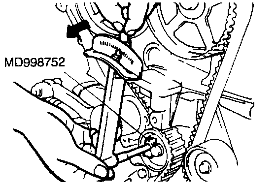 2. Holding the timing belt "B" tensioner up with your finger in the direction of the arrow, place pressure on the timing belt so that the tension side of the belt is taut. Now tighten the bolt to fix the tensioner.