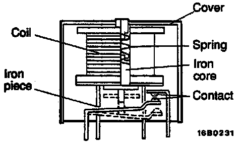 1. When current flows through the coil of a relay, its core is magnetized to attract the iron piece, closing (ON) the contact at the tip of the iron piece. When the coil current is turned off, the iron piece is made to return to its original position by a spring, opening the contact (OFF).