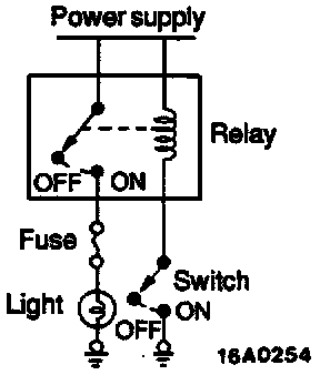 2. By using a relay, a heavy current can be turned on and off by a switch of small capacity. For example, in the circuit shown here, when the switch is turned on (closed), current flows to the coil of the relay. Then, its contact is turned on (closed) and the light comes on. The current flowing at this time to the switch is the relay coil current only and is very small.