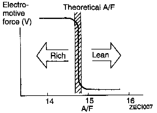If the air/fuel mixture ratio is richer than the theoretical air/fuel mixture ratio (i.e., if the concentration of oxygen in the exhaust gas is sparse), a voltage of approximately 1v is output; if the air/fuel mixture ratio is leaner than the theoretical air/fuel mixture ratio (i.e., if the concentration is dense), a voltage of approximately O V is output.