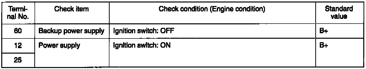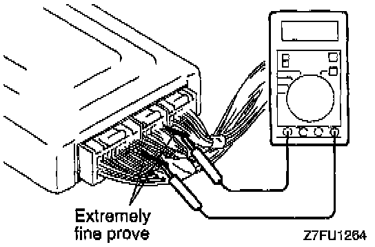 2. At each terminal of the engine control module connector, insert the extremely fine probe from the wire side, and measure the voltage referring to the check chart.