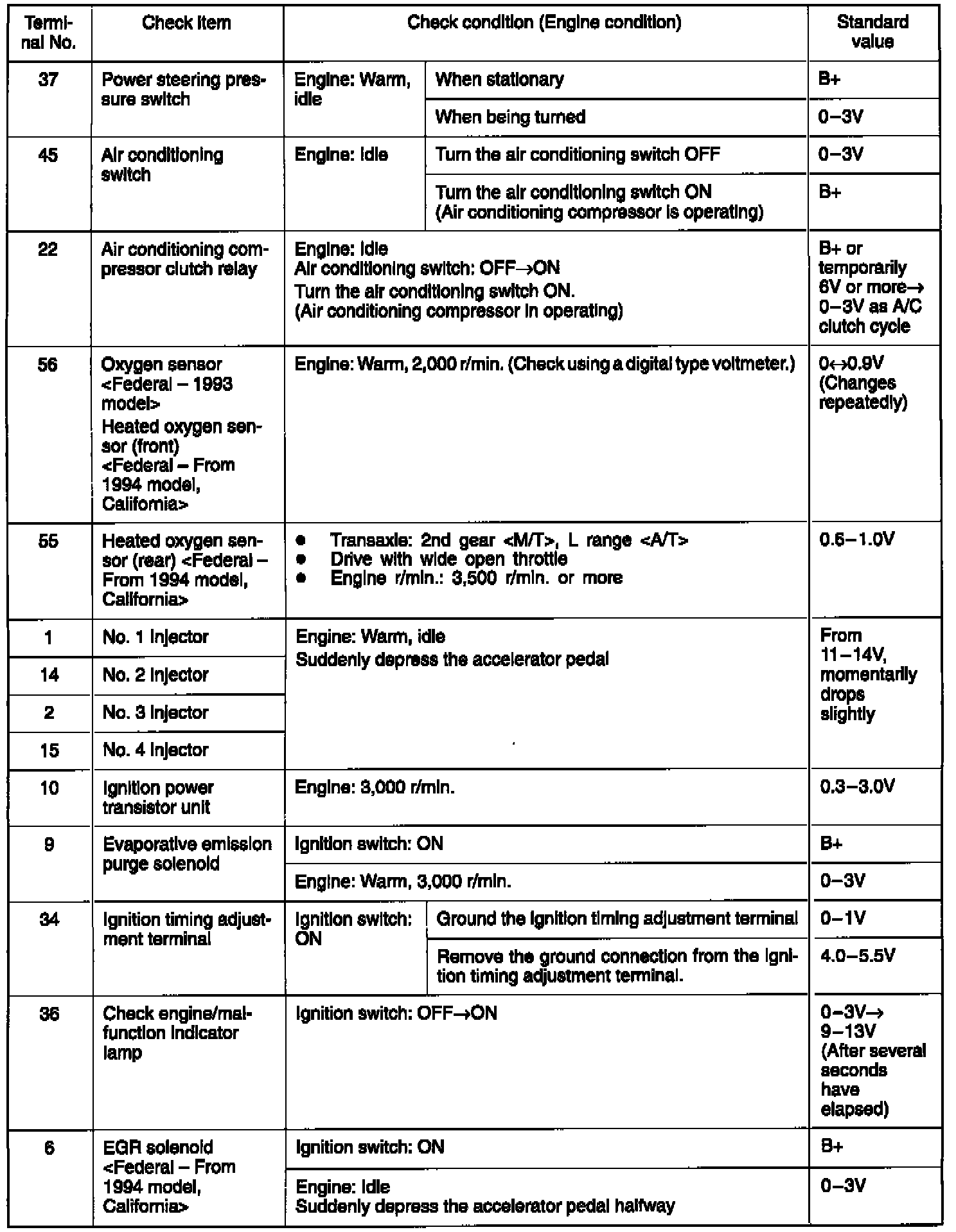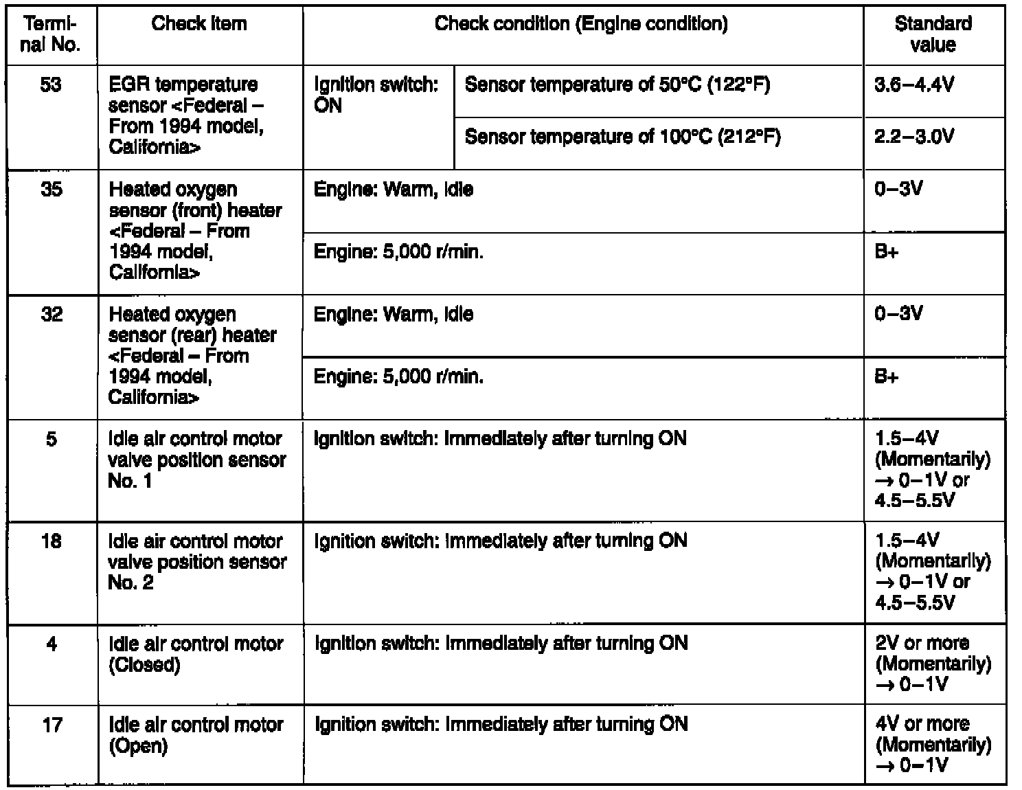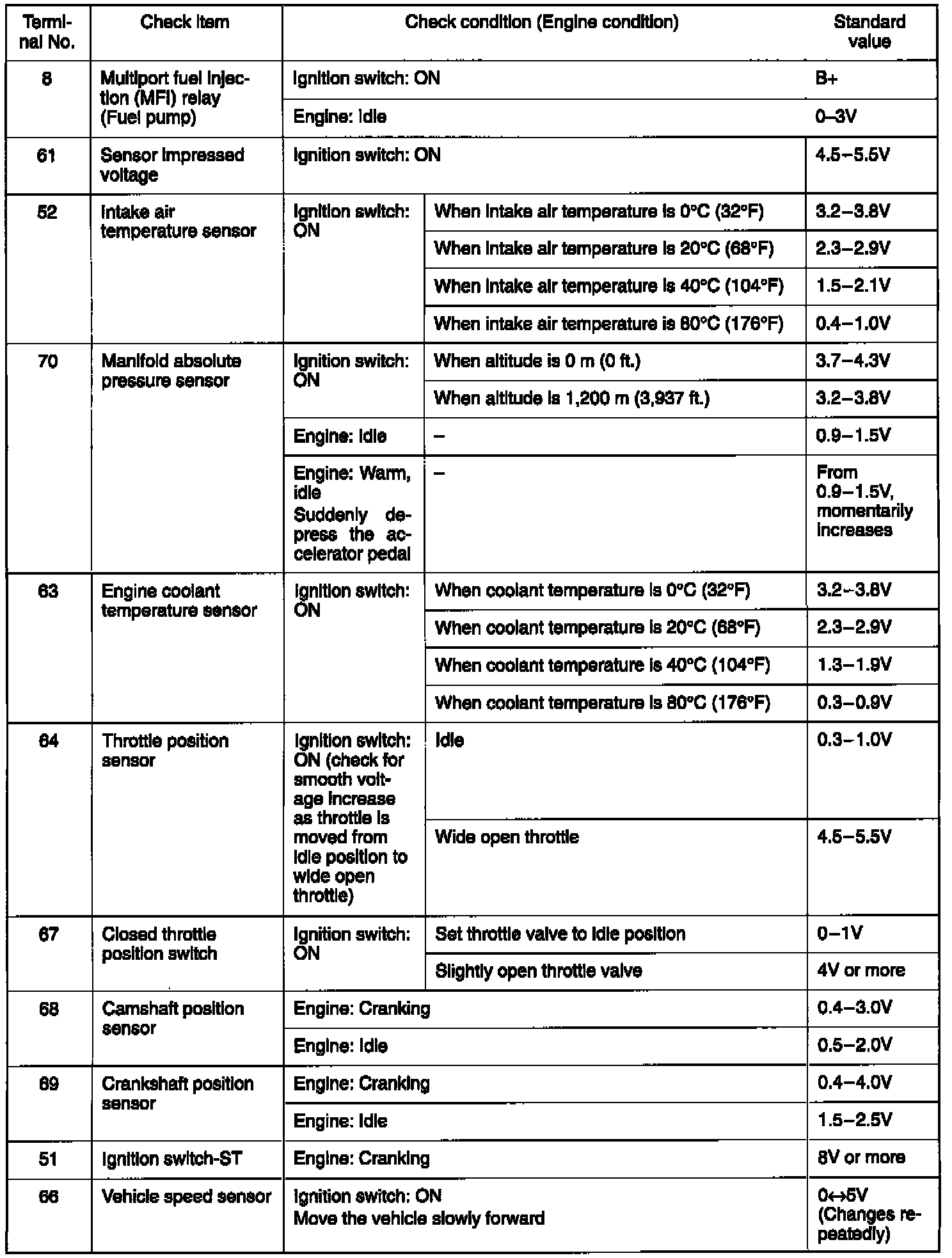 3. If voltmeter shows any deviation from standard value, check the corresponding sensor, actuator and related electrical wiring, then repair or replace.