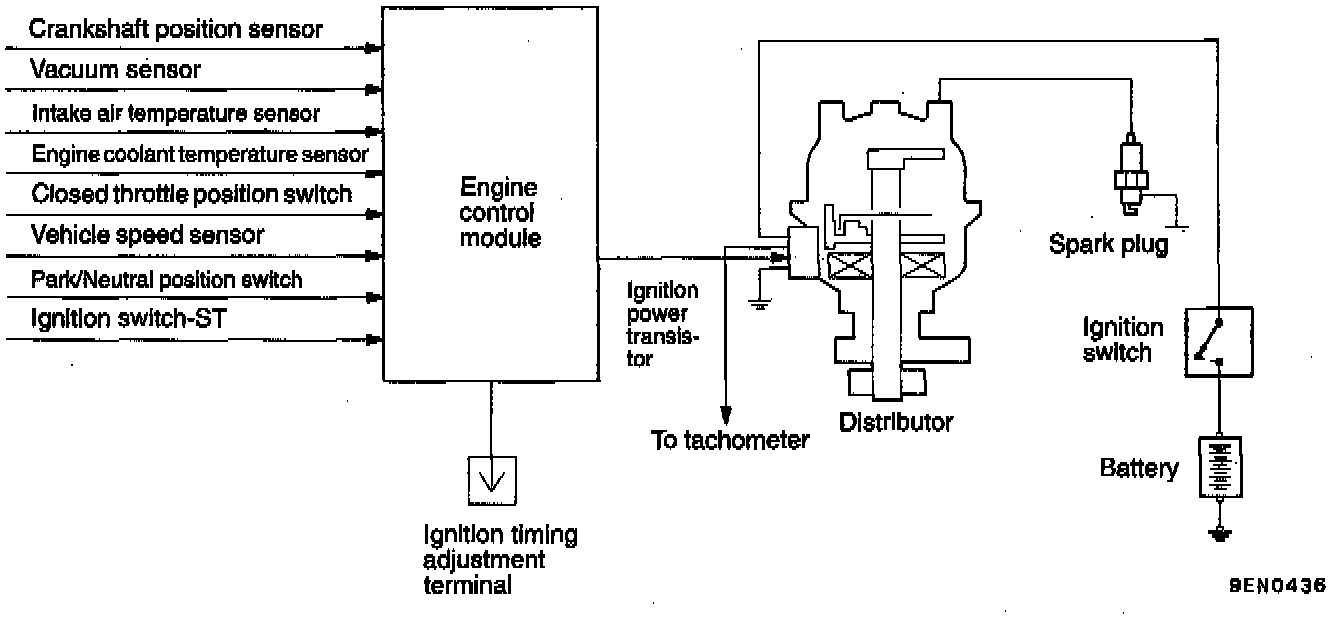 The engine control module detects the crankshaft position by the crankshaft position sensor incorporated in the distributor to provide ignition at the most appropriate timing for the engine operating condition.