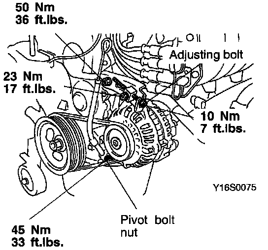 5. After adjusting the belt tension, fully tighten the nut of the pivot bolt and the lock bolt to the specified torque, and then tighten the adjusting bolt to the specified torque.