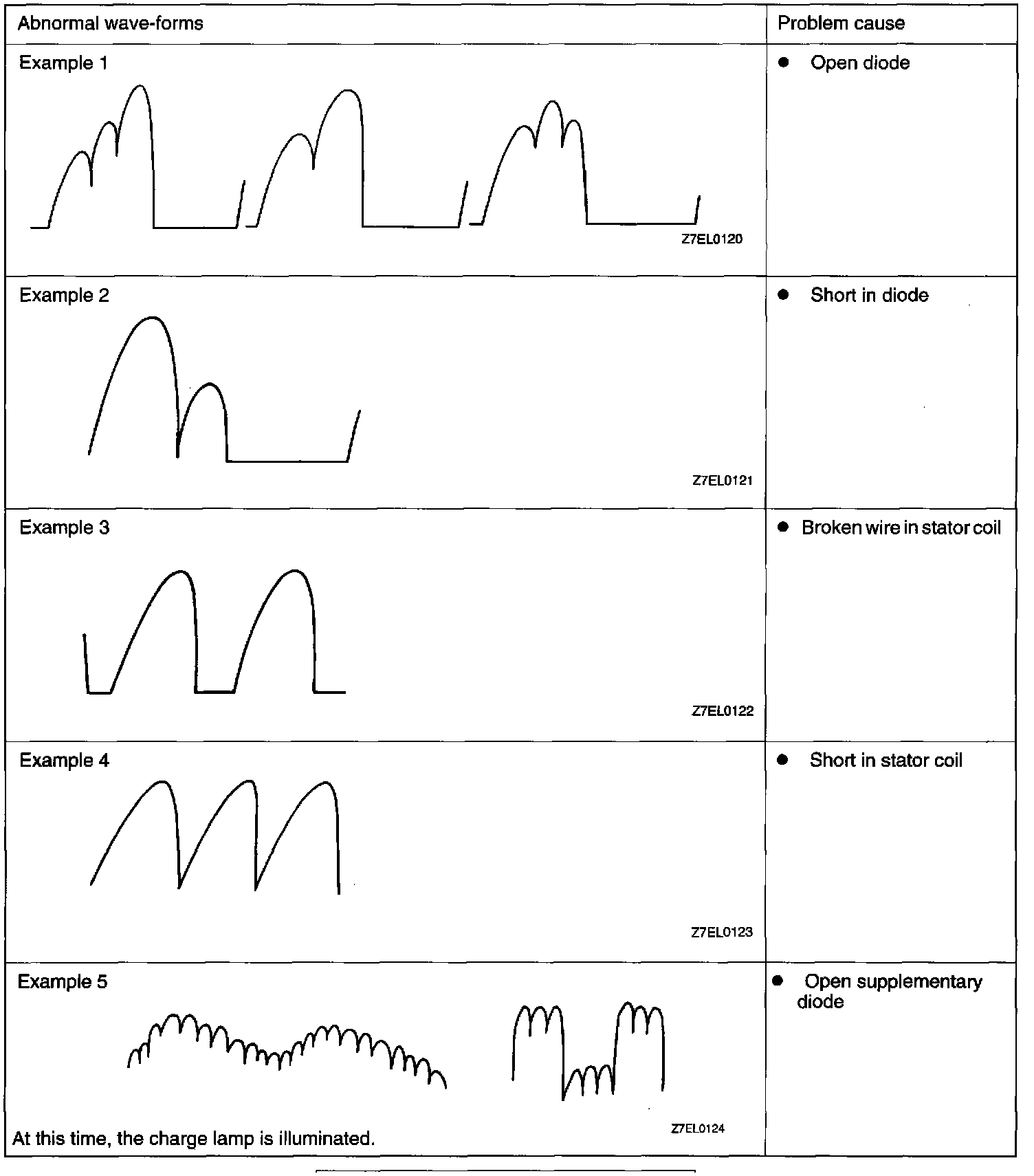 2. Identification of abnormal waveforms is easier when there is a large output current (regulator is not operating). (Wave-forms can be observed when the headlamps are illuminated.)