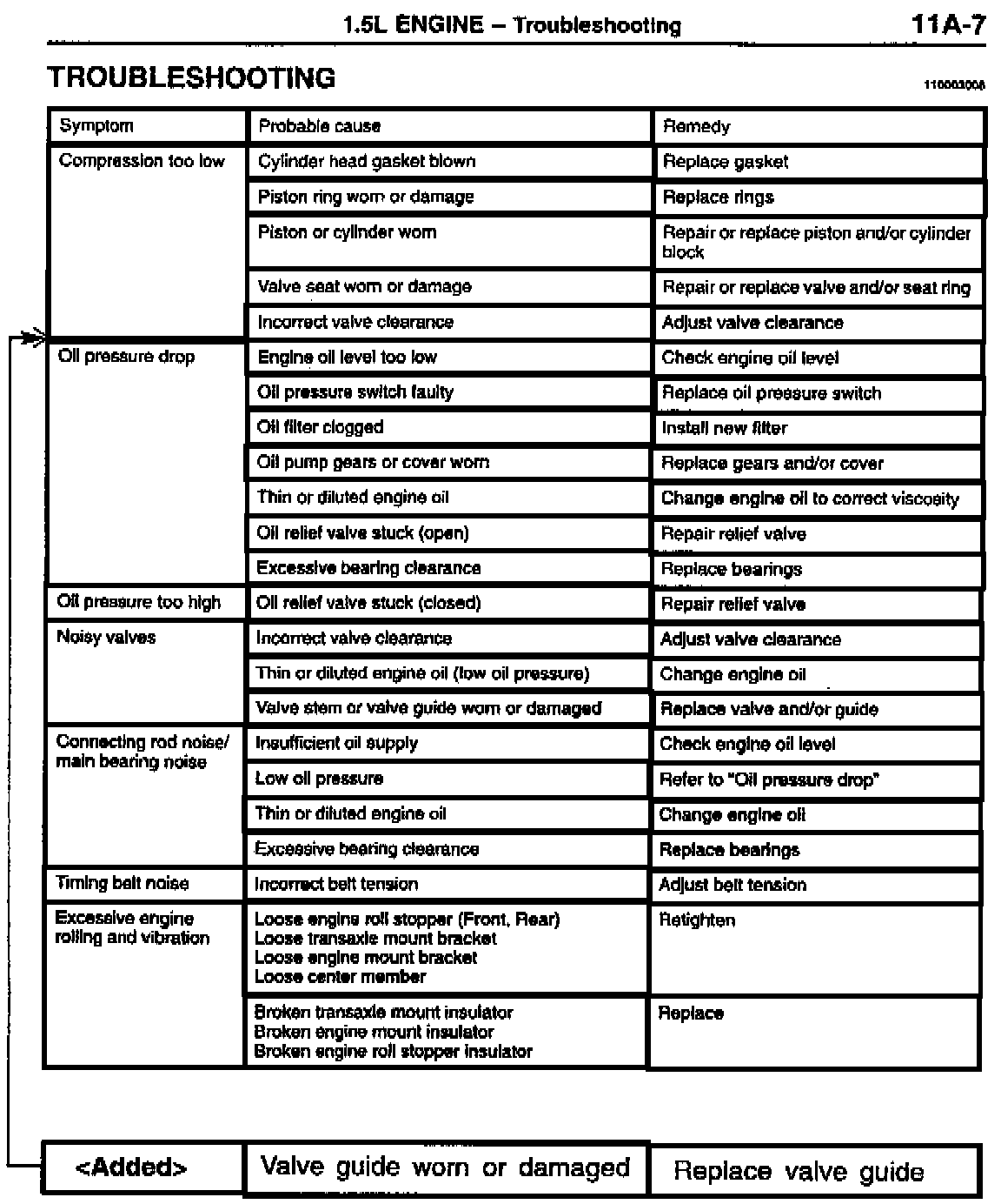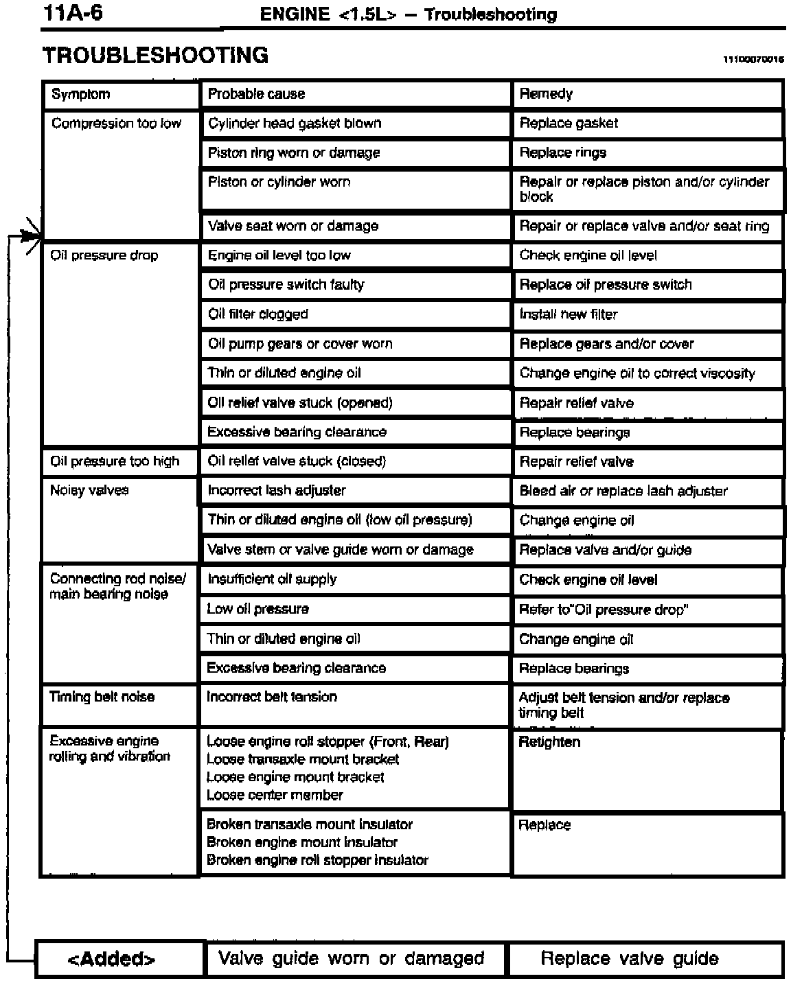 This bulletin adds a new item to the engine troubleshooting chart for the 1993-97 Mirage equipped with the 1.5L engine. The additional information gives "worn or damaged valve guides" as another probable cause for engine compression that is too low. A diagnosis of worn or damaged valve guides would require replacement of the guides.