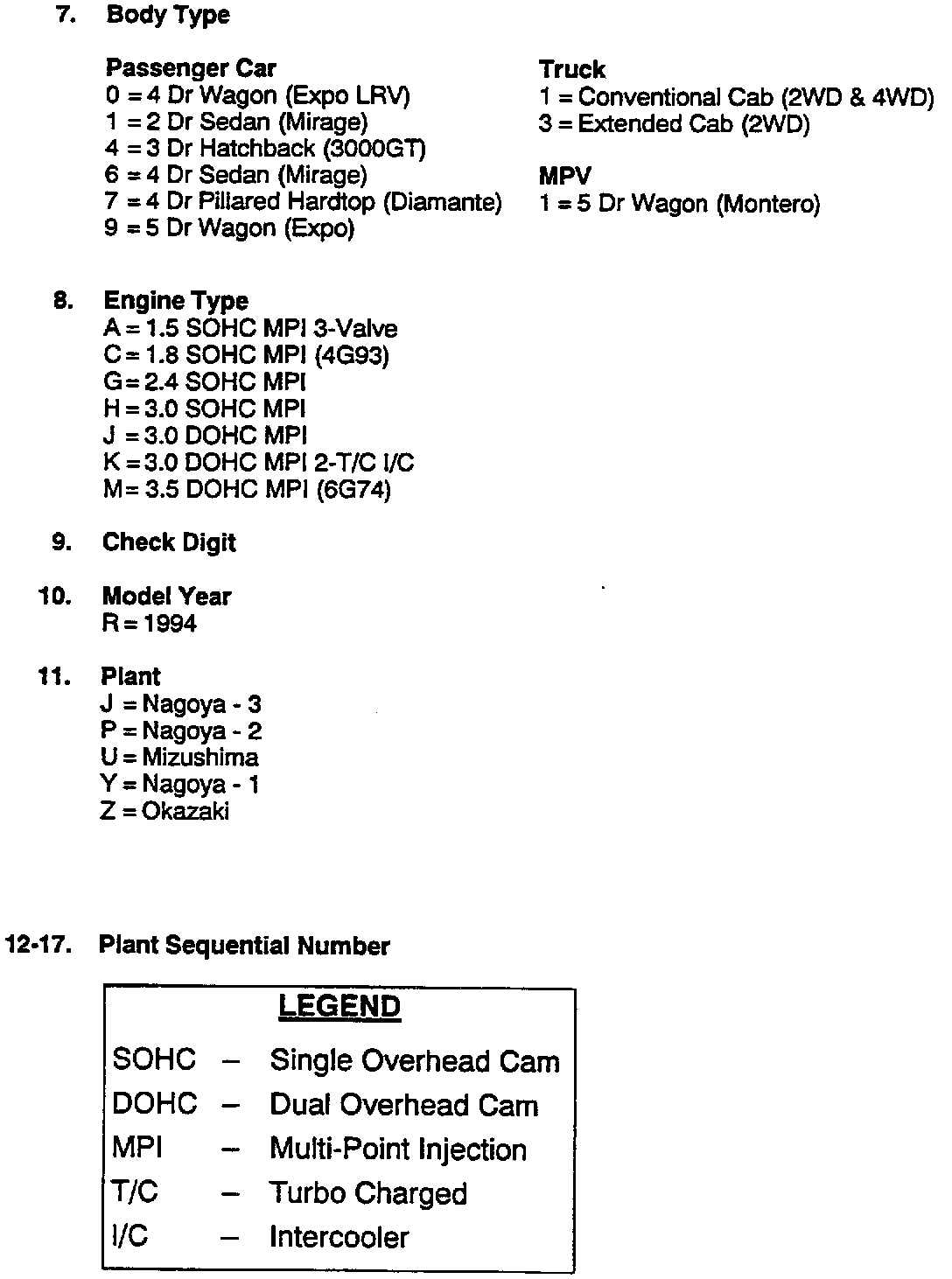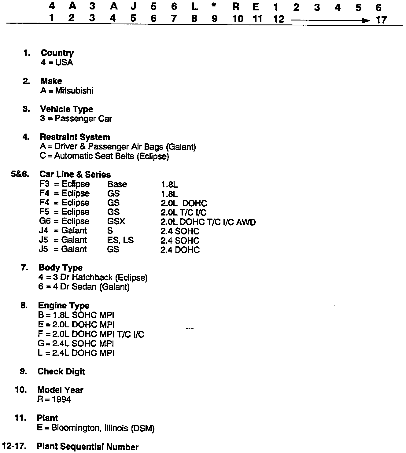 This bulletin contains information to decode the Vehicle Identification Numbers on all 1994 MMSA cars & trucks. For VIN information on 1983-1992 vehicles, refer to TSB-92-00-005. And for VIN information on 1993 vehicles, refer to TSB-92-00-004.