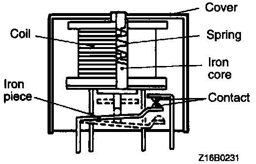 1. When current flows through the coil of a relay, its core is magnetized to attract the iron piece, closing (ON) the contact at the tip of the iron piece. When the coil current is turned off, the iron piece is made to return to its original position by a spring, opening the contact (OFF).