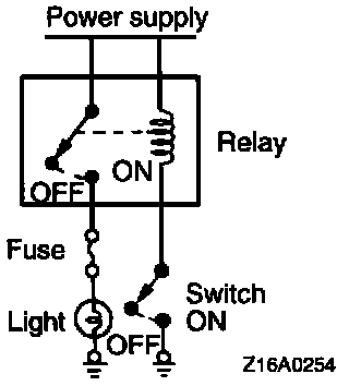 2. By using a relay, a heavy current can be turned on and off by a switch of small capacity. For example, in the circuit shown here, when the switch is turned on (closed), current flows to the coil of the relay. Then, its contact is turned on (closed) and the light comes on. The current flowing at this time to the switch is the relay coil current only and is very small.