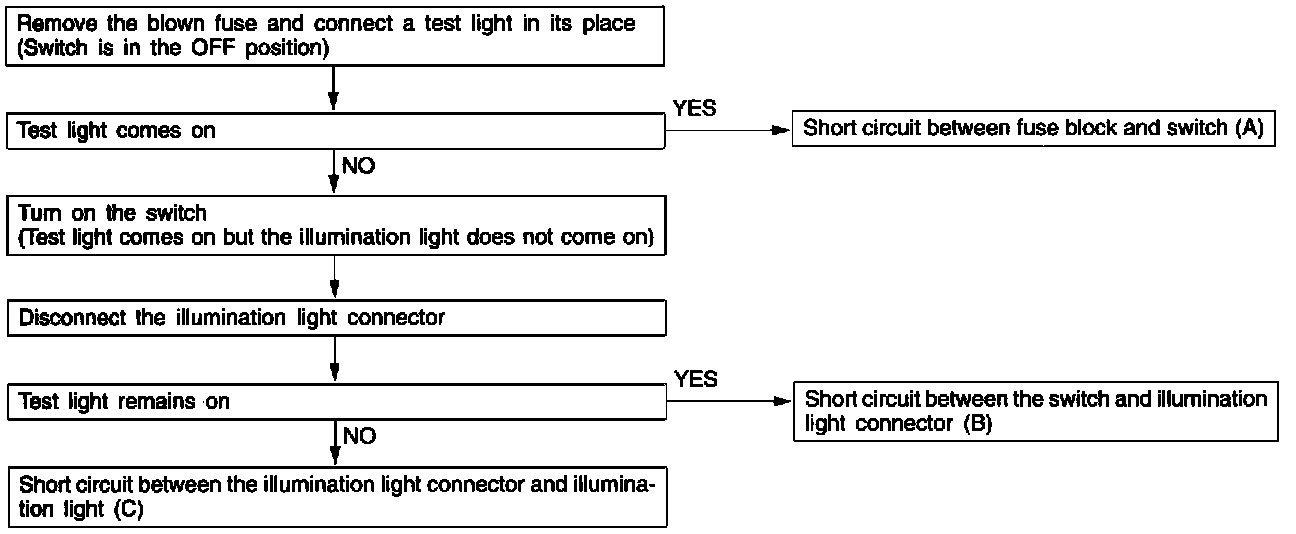 Because the fuse has blown. It is probable that there is a short-circuited circuit. Follow the procedures above to narrow down the short-circuit location.