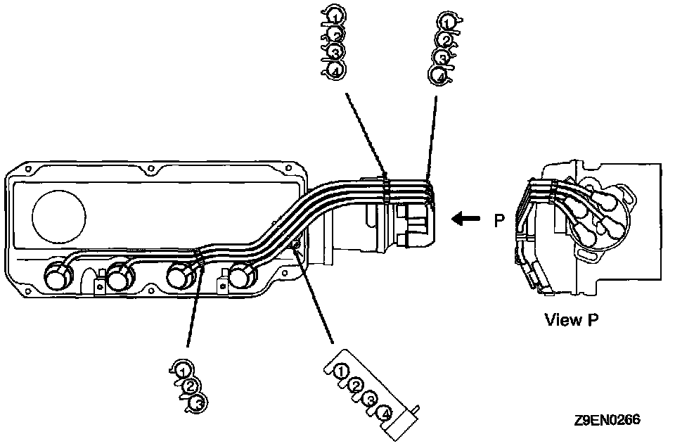 2. The numerals on the support and clamp indicate the spark plug cable No.