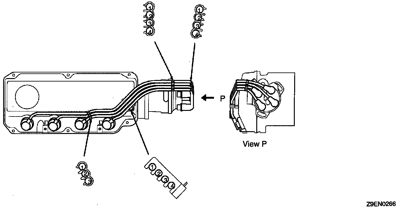 Improper arrangement of spark plug cables will induce voltage between the cables, causing miss firing and developing a surge at acceleration in high-speed operation. Therefore, be careful to arrange the spark plug cables properly by the following procedure.