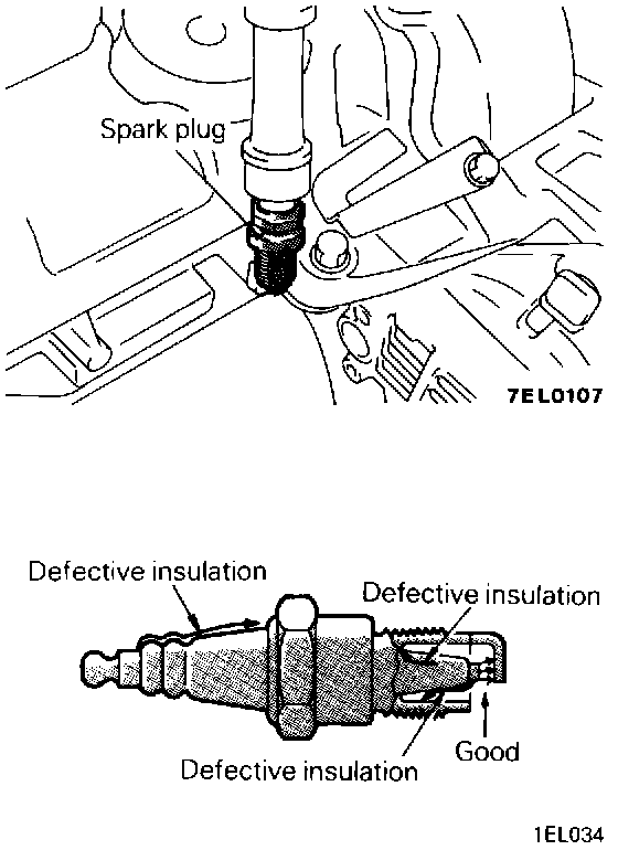 2. Ground the spark plug outer electrode (body), and crank the engine. Check to be sure that there is an electrical discharge between the electrodes at this time.