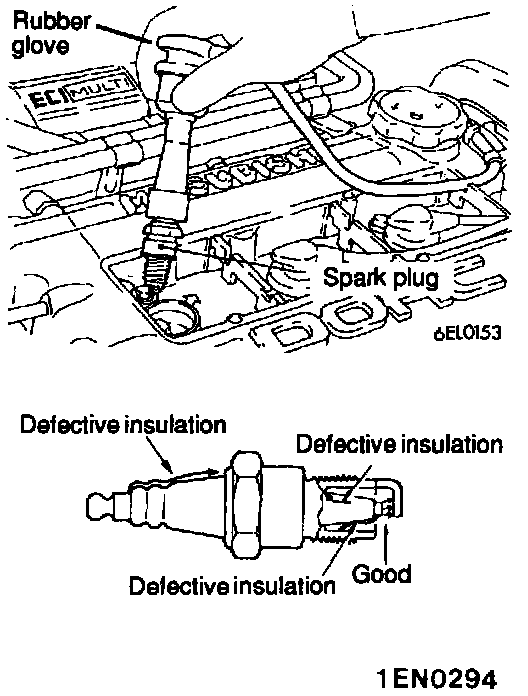 2. Ground the spark plug outer electrode (body), and crank the engine. Check for spark across the electrodes.