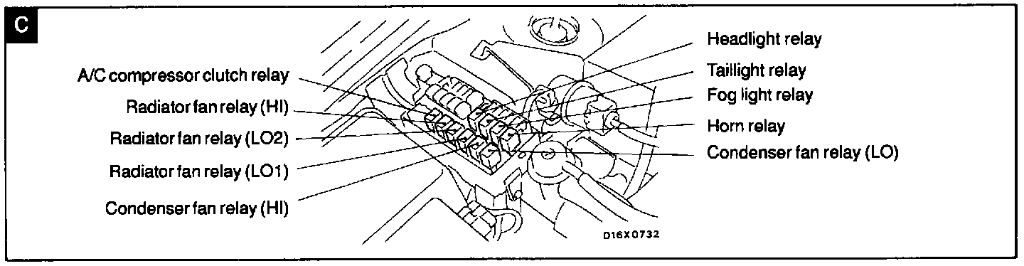 A/C Compressor Clutch, Radiator Fan (HI, LO1 & L02), Condenser Fan (LO & HI), Headlight, Taillight Fog Light And Horn Relays: