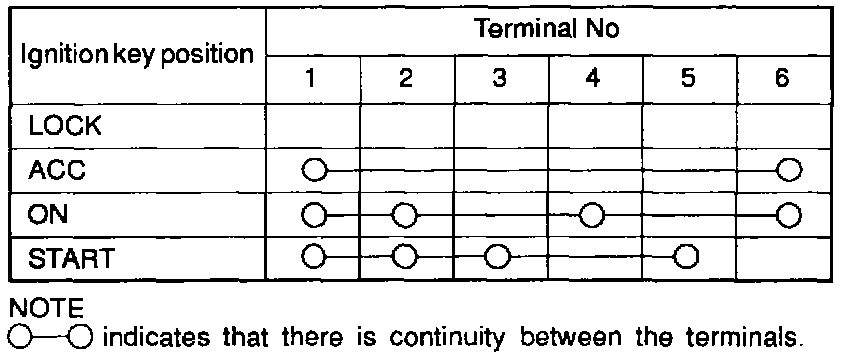Ignition Switch Continuity Check Table: