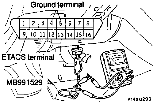 1. Use the special tool to connect a voltmeter between the ground terminal and the ETACS terminal of data link connector.
