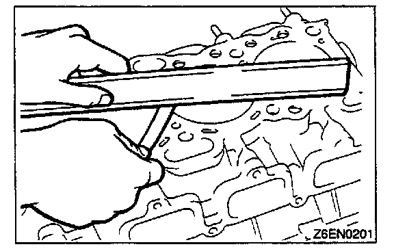 1. Check the cylinder head gasket surface for flatness by using a straightedge and thickness gauge.