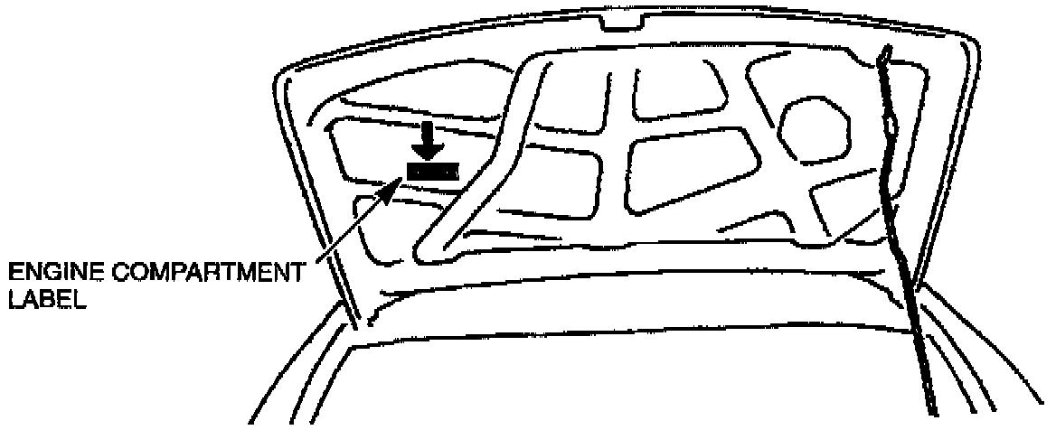 16. Carefully remove all dirt and oil from the vacant area shown on the underside of the hood. Affix the Engine Compartment label in the area shown.