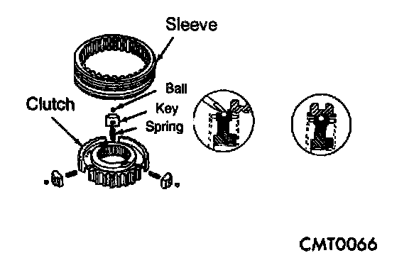 DISASSEMBLYPlace synchronizer in a clean shop towel and wrap. Press on inner hub. Carefully open up shop towel and remove springs, balls, keys, hub, and sleeve.