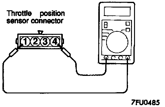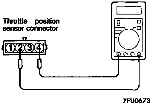 3. Measure the resistance between the throttle position sensor side connector terminal 2 and terminal 4. Open the throttle valve slowly until fully open from the idle position. Check that the resistance changes smoothly in proportion to the opening angle of the throttle valve.