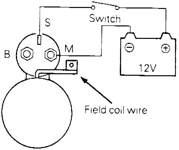 2. Connect a 12 volt battery between "S" and "M" terminals. This test must be performed in less than 10 seconds to prevent coil from burning out.